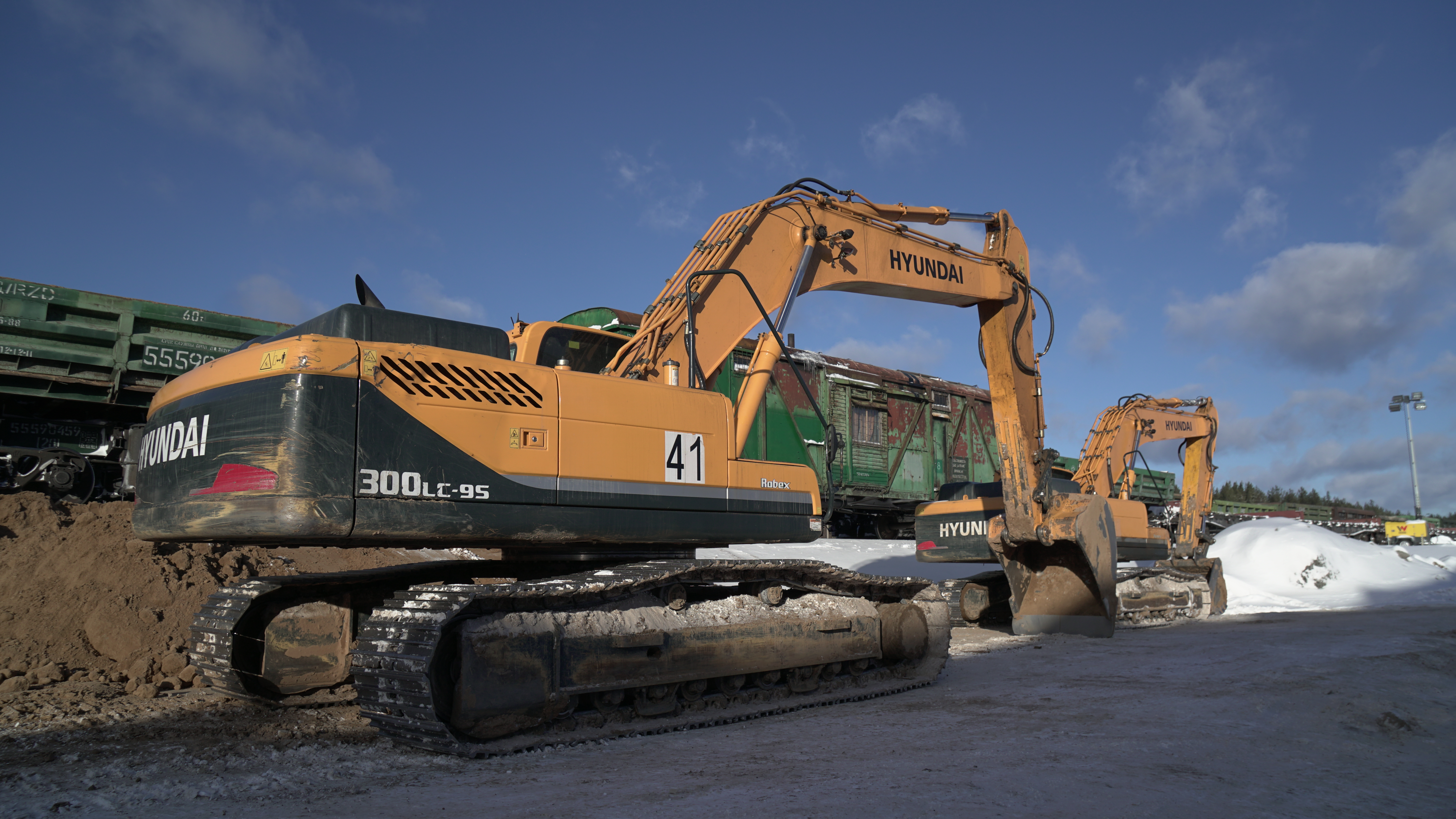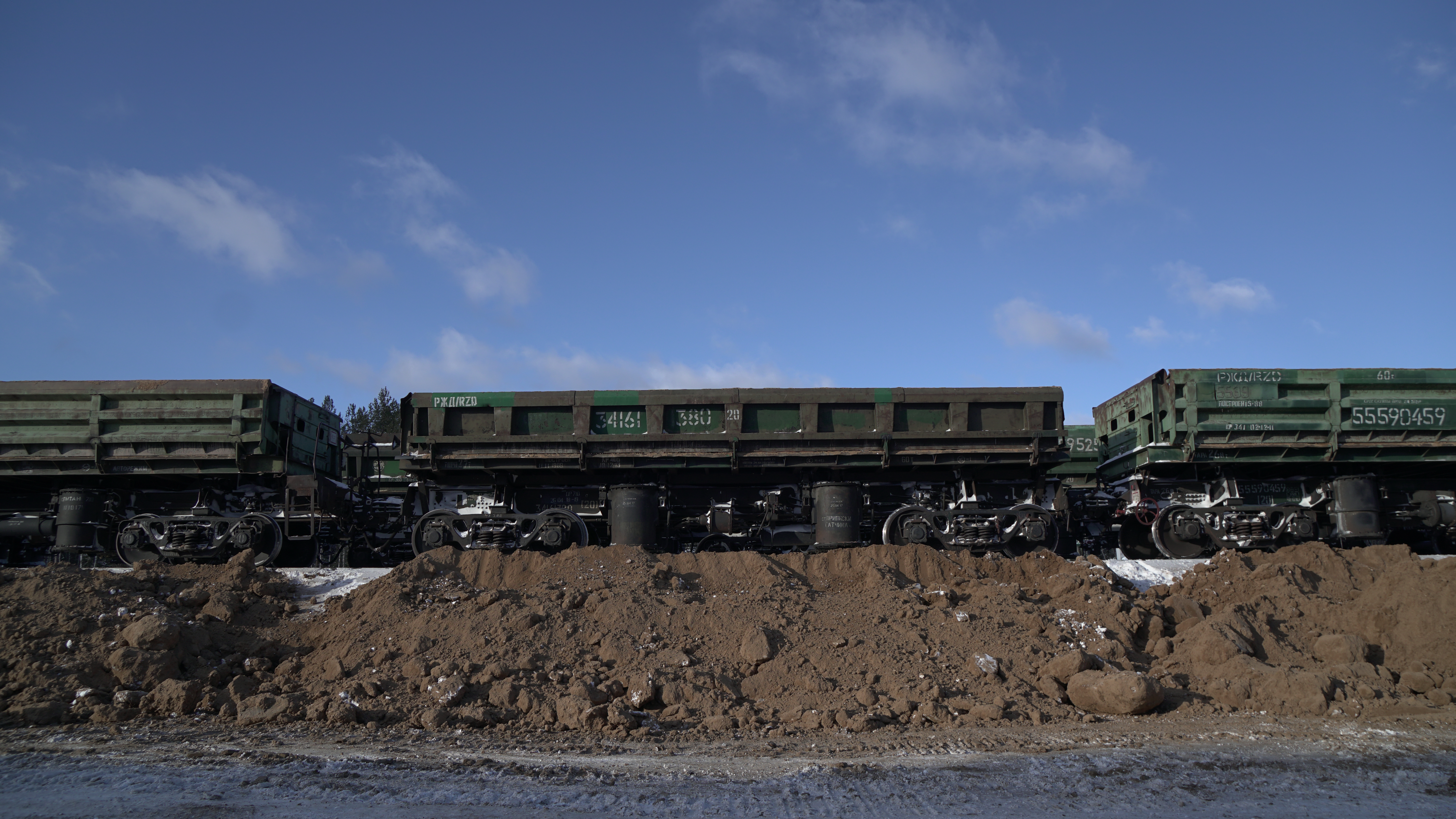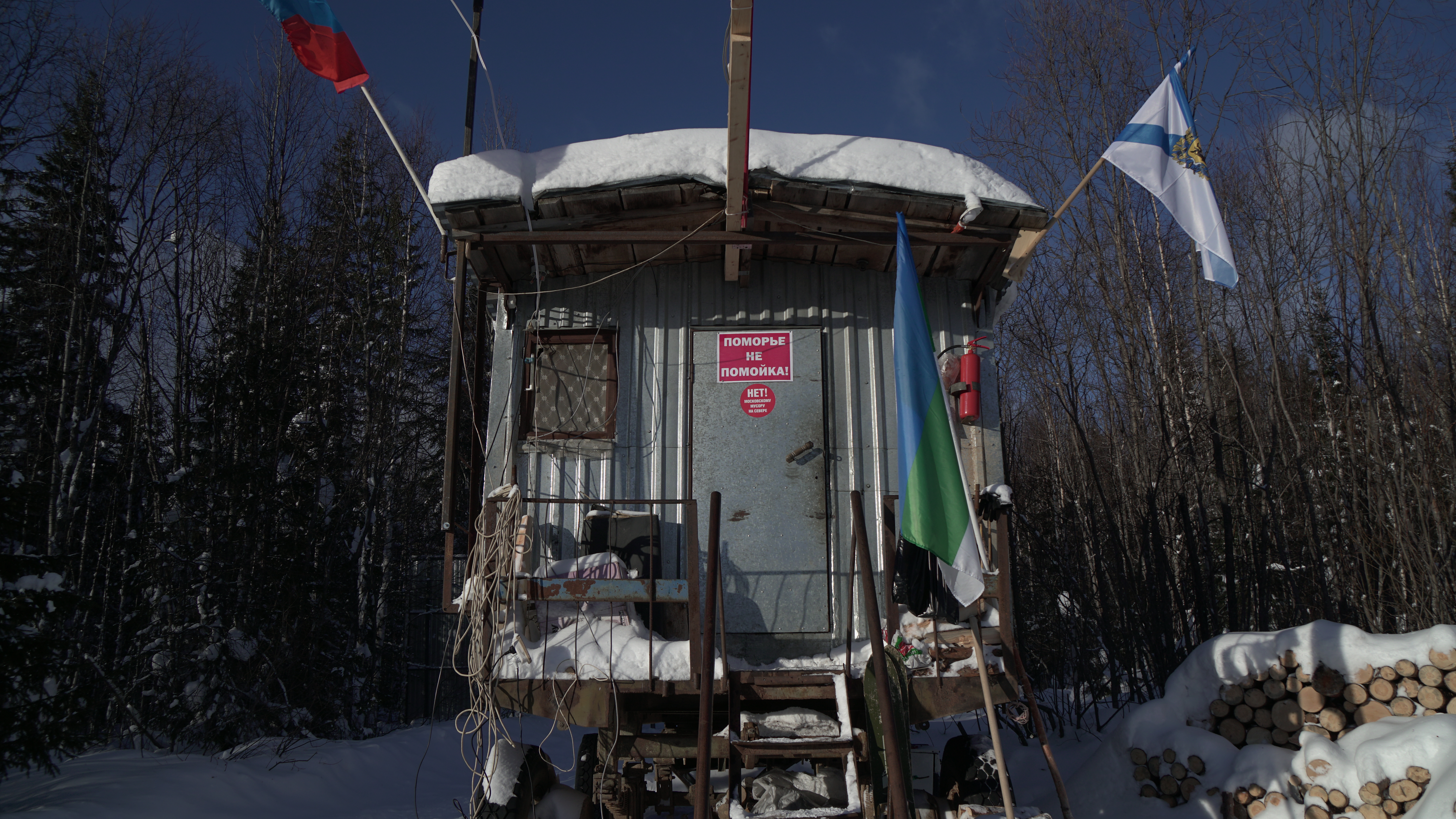 За пару дней до приезда комиссии вокруг стройки начали возводить шестиметровый железный забор. На нем тут же появилась надпись "Путин, останови стройку!". Жители соседней Урдомы и волонтеры, которые поселились в фургоне рядом со стройкой и круглосуточно фиксируют нарушения, говорят, что не знают, кто написал воззвание. Забор отделяет фургон волонтеров от дороги, ведущей к стройке мусорного полигона. Для членов комиссии и журналистов ворота открывают, и в этот момент из-за облаков выходит солнце и заливает все светом. Веселые оранжевые экскаваторы выгружают песок из вагонов, снег искрится. Но активисты знают: двумя днями ранее один из экскаваторов провалился в грунт.