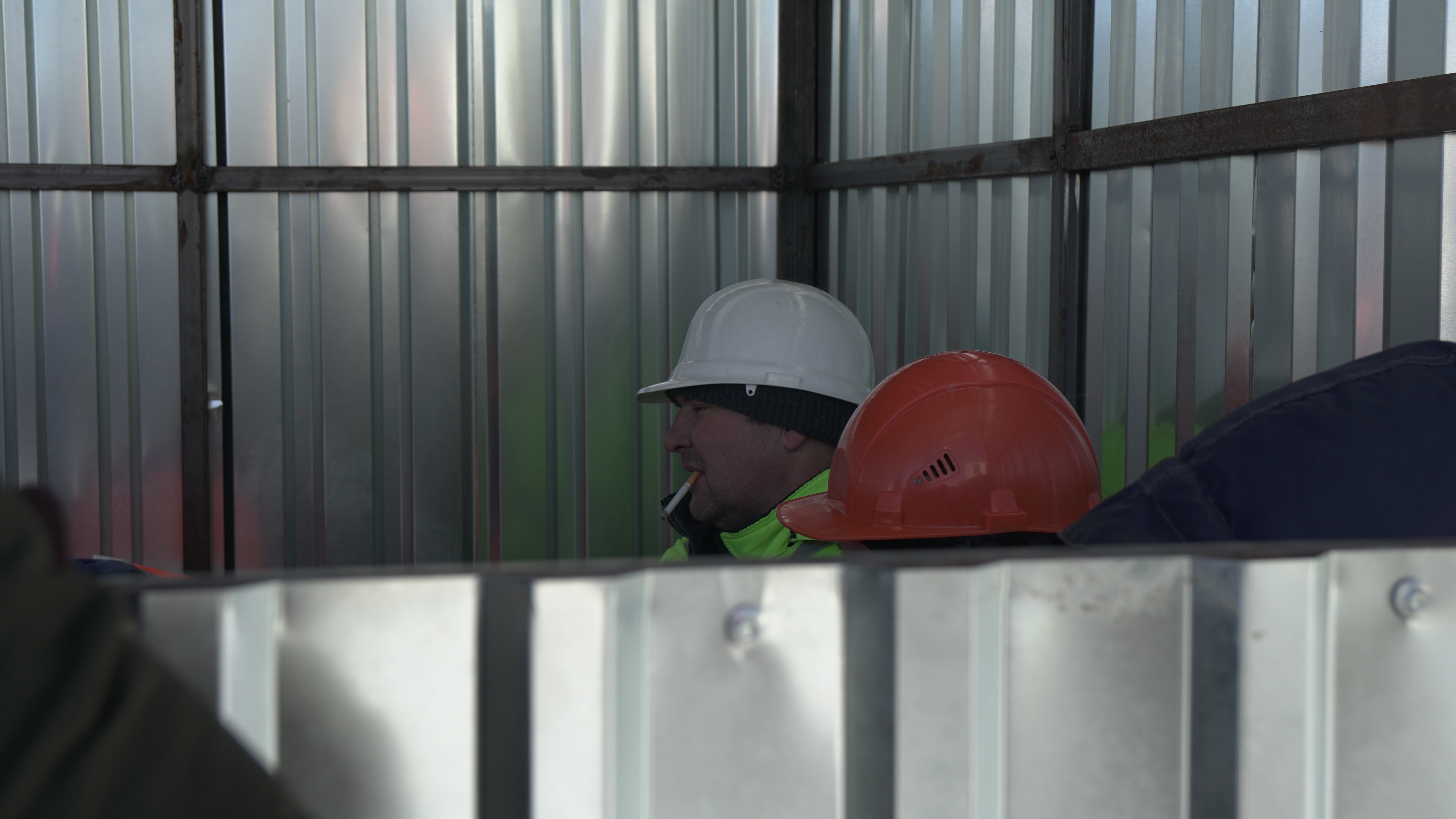 И замечает нескольких человек в желтых жилетах и оранжевых касках, которые вышли на перекур. Они не отвечают на вопросы и стараются даже не пересекаться взглядами с посторонними людьми. Но один из рабочих все-таки говорит, что приехал на стройку из Ухты – города в Коми. Он держится увереннее остальных и похож на мастера бригады.