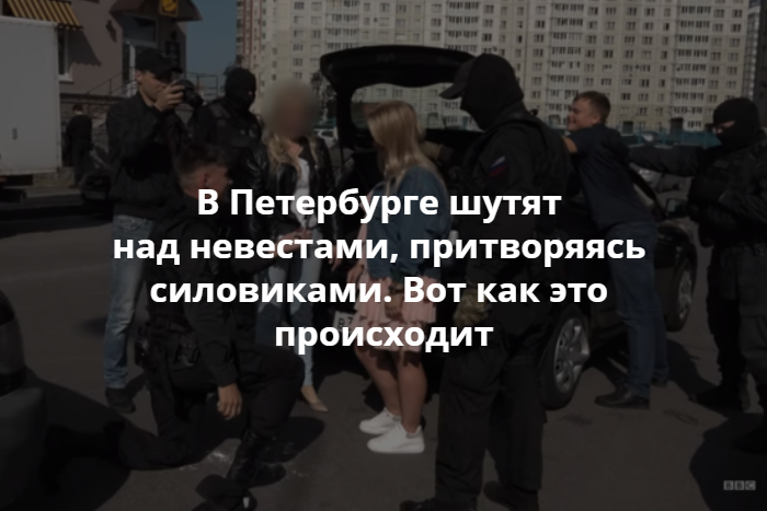 «Русская служба Би-Би-Си» выпустила материал о том, как в Петербурге и других городах России проводят шуточные мероприятия, на которых ряженые силовики задерживают невесту или жениха, чтобы им сделали предложение выйти замуж.