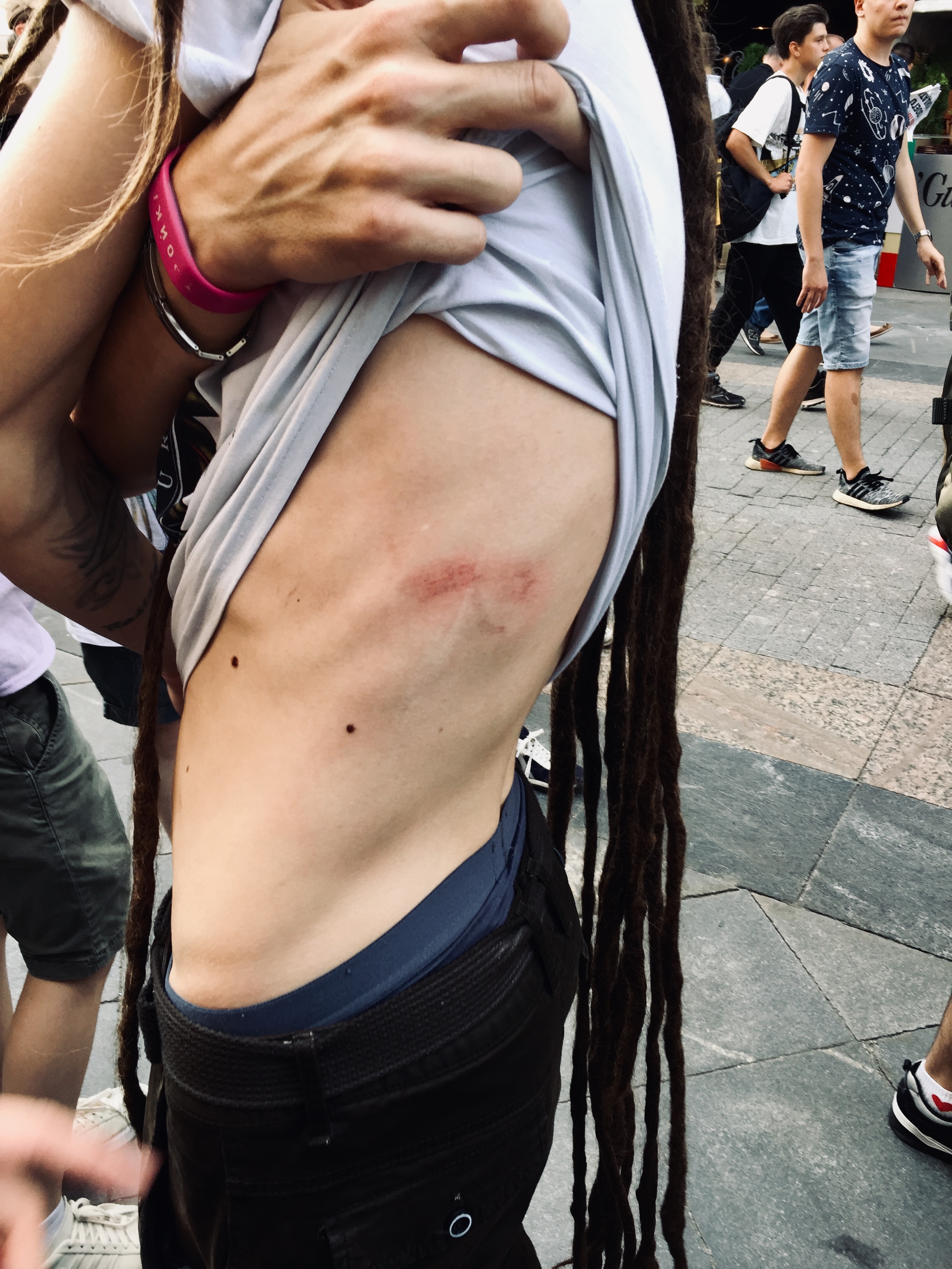 Как это было: «[Нацгвардейцы] выдавливали людей из Камергерского. В какой-то момент они прошли мимо нас. Сзади перекрыто, мы начали за ними двигаться потихоньку. Вдруг отряд получает команду "стоп" и "развернуться". А мы тащимся сзади. Они развернулись и пошли в нашу сторону. Я разворачиваюсь в правую сторону, чтобы отойти с [их] дороги. И в этот левый бок получаю ускорение [дубинкой с электрошокером]. Я просто офигел от этого и громко закричал, что шокерами бьют. Это как удар током, в напряжении скрючилась рука и нога левая. Она у меня подкосилась и я начал падать. Ощущение какое-то такое не очень приятное».