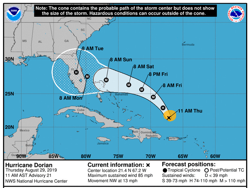 Ранее специалисты Национального центра по наблюдению за ураганами США предупредили, что "Дориан" достигнет побережья Флориды к концу текущей недели или началу следующей. К этому времени он, вероятно, значительно усилится и будет классифицироваться как ураган четвертой категории из пяти возможных по шкале Саффира - Симпсона.