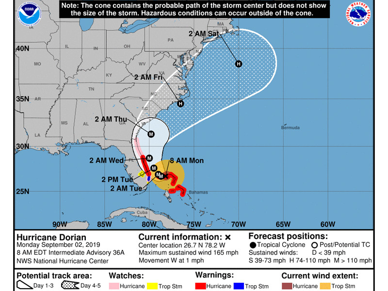 30 августа президент США Дональд Трамп ввел режим чрезвычайной ситуации во Флориде из-за приближающегося "Дориана", на борьбу с последствиями стихии была выделена федеральная помощь. Режим ЧС ввели и в нескольких округах штата Джорджия. Власти Содружества Багамских островов начали экстренную эвакуацию жителей. Из-за стихийного бедствия Трамп отменил намеченный на начало следующей недели визит в Польшу. По его словам, для него очень важно находиться в США во время бедствия.