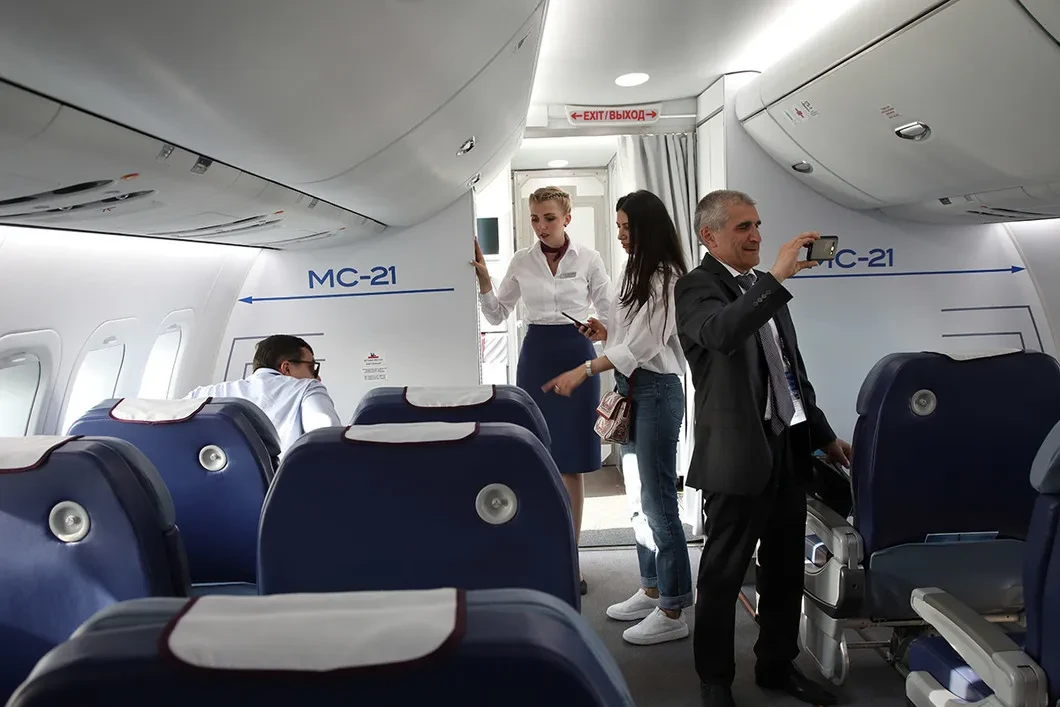 На борту нового самолета чувствуется запах материалов сине-голубой кожаной обивки кресел, яркий солнечный свет освещает салон через непривычно большие иллюминаторы. Внутри современный МС-21 заметно отличается от своих прямых конкурентов Boeing 737 MAX, Airbus A220 и Airbus A320neo. Так, например, проход между рядами как в бизнес-классе, так и в экономе довольно широкий. «Рассчитывали, что в салоне одновременно загружать свои вещи в верхние ящики смогут сразу два человека, стоя спина к спине и не мешая при этом друг другу», — рассказывает девушка-консультант, работающая на неоправданно высоких каблуках и в костюме стюардессы. Она представляет Объединенную авиастроительную корпорацию (ОАК, туда входит разработчик борта — корпорация «Иркут»).