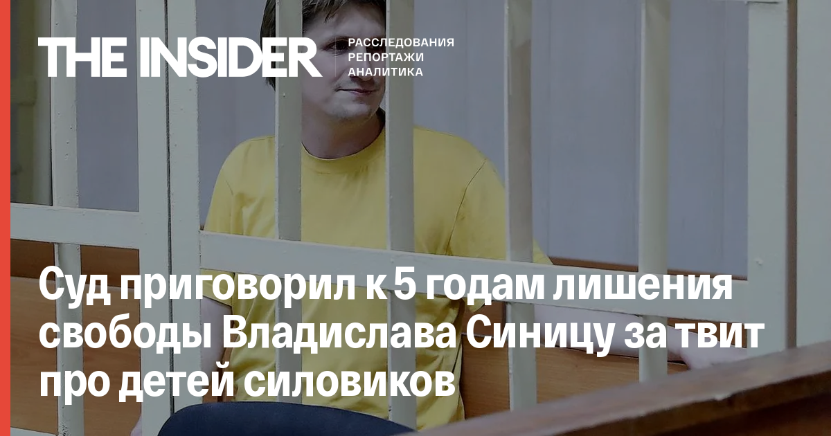 Пресненский суд Москвы приговорил Владислава Синицу к пяти годам лишения свободы за сообщение в Twitter про детей силовиков. Он признан виновным в «возбуждении ненависти или вражды в интернете с угрозой применения насилия» (пункт «а» ч. 2 ст. 282 УК).