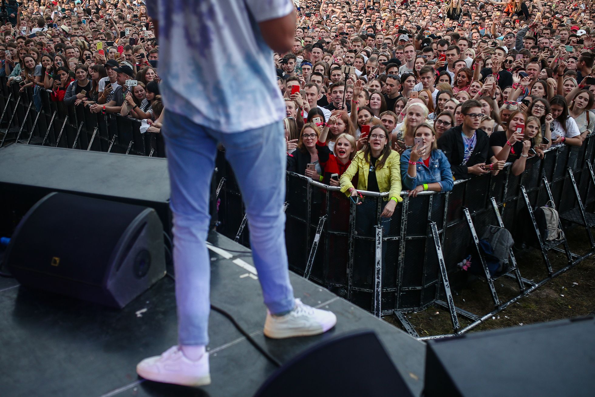 Но когда на сцену выходит Тима, к ней устремляются люди. Артист прыгает по сцене, с готовностью радуя зрителей (их пришло около трех тысяч) своими будто бы неловкими, но уже ставшими фирменными движениями. Те вместе с ним поют наизусть едва ли не все его песни. Главные хиты — «Мокрые кроссы», «Незабудку» и «Витаминку» — Белорусских исполняет дважды.
