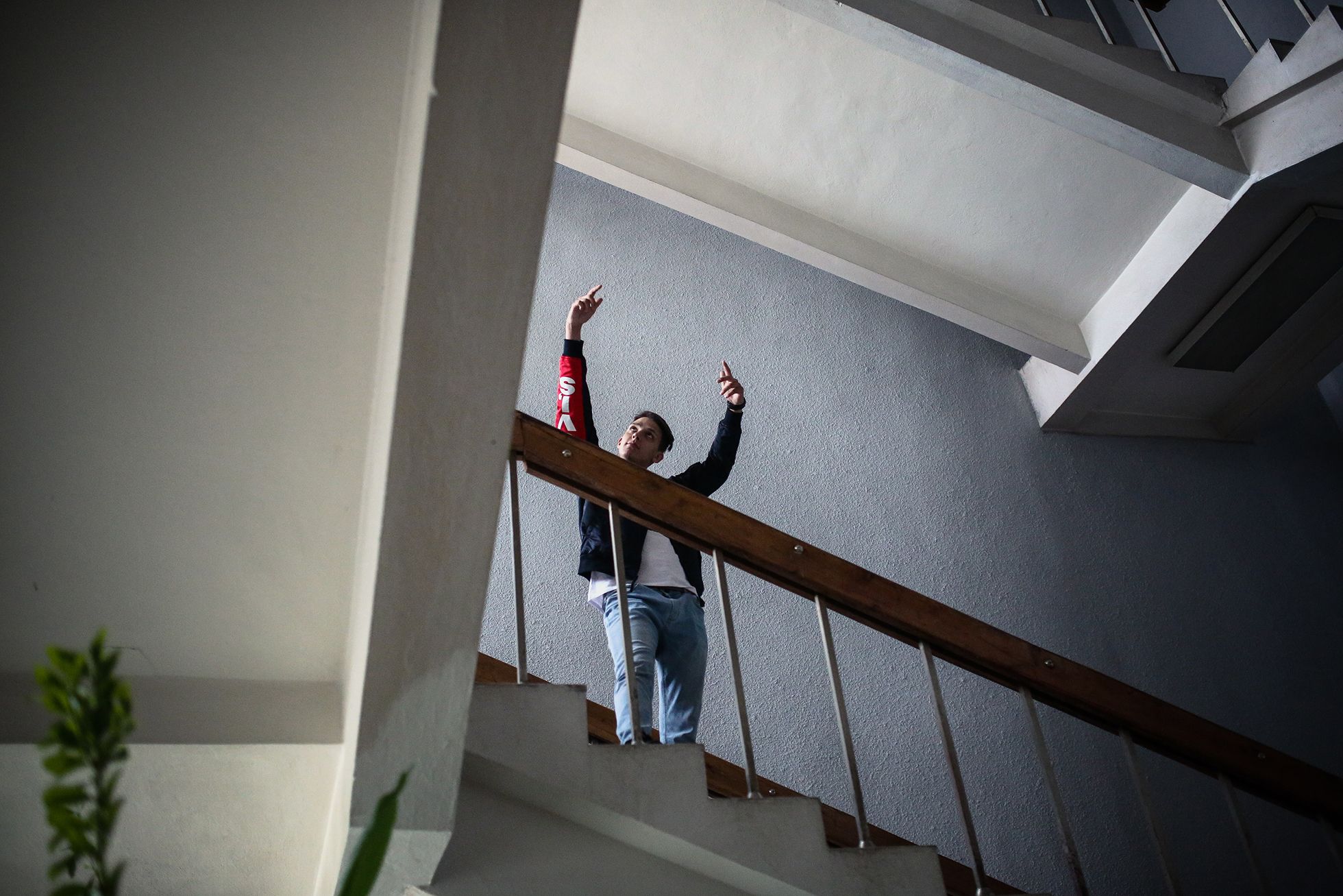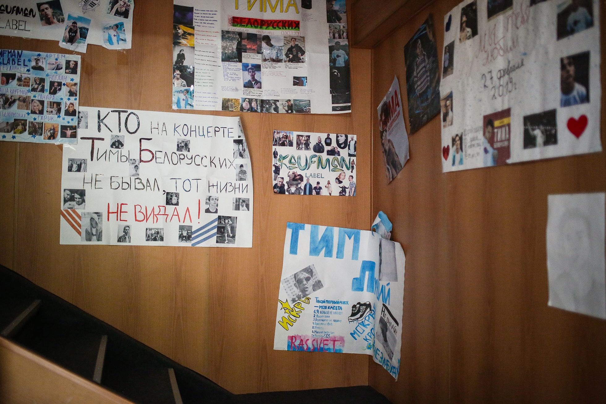 Охранник, который встречает нас на входе в колледж, не узнает Тиму и без головного убора, но пройтись по родным коридорам бывшему ученику не запрещает — просит только написать свою фамилию и расписаться в журнале. Продюсер и руководитель белорусского лейбла Kaufman Александр Розниченко и аранжировщик Ян Супоненко — они с Тимой учились в одном классе — шутят, что этот автограф Белорусских — самый дорогой.