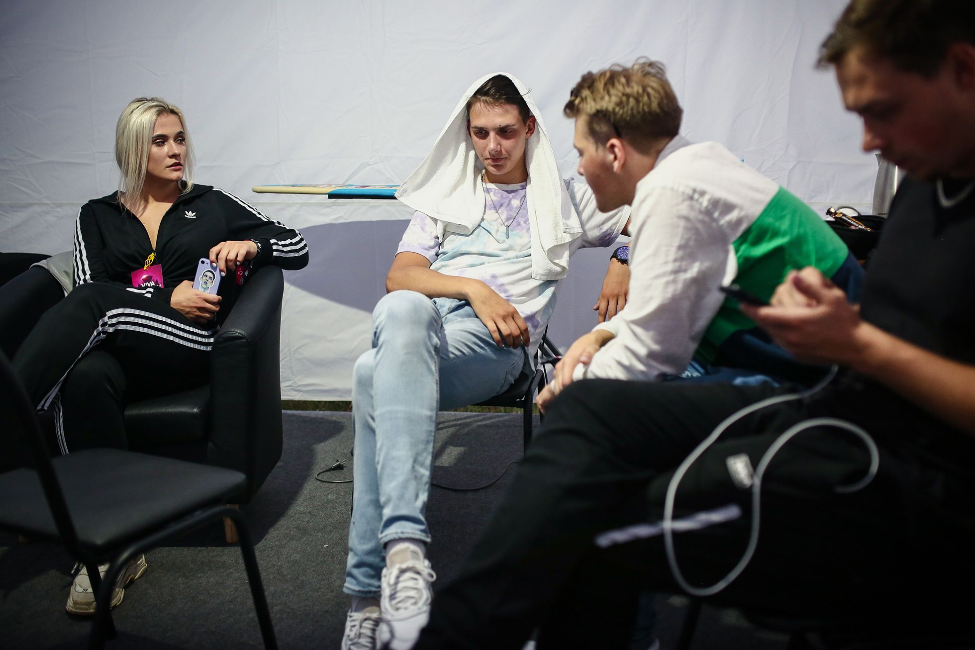 Пока остальные пробуют бургеры, Тима ест бутерброд с сыром и помидором и играет в футбол на PlayStation. Периодически заходят организаторы фестиваля — чтобы удостовериться, в хорошем ли артист настроении, и попросить сфотографироваться. Белорусских никому не отказывает.