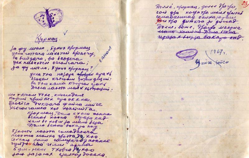 Рукопись стихотворения «Бабочка»Фото: Музей истории ГУЛАГа Существовало такое понятие — трудодни. Можно было за день заработать трудодень, а за некоторые очень тяжелые работы — полтора, а то и два трудодня. Мой отец имел чистый трудодень каждый день, потому что работал в мастерской. Работали за минимальную еду, просто чтобы душа держалась в теле. Председатель колхоза Михайлюк был маленьким Сталиным, о людях не думал, главным для него была работа. Люди могли умирать с голоду, главное, чтобы они выполнили заготовки. После того, как государство все забирало, там мало чего оставалось. На трудодни — 100 граммов, 200 граммов…Первый раз, когда мы получили за год шесть мешков пшеницы, мы говорили — вот это житуха!
