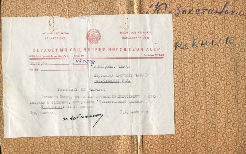 Сопроводительная записка председателя Верховного суда Чечено-Ингушской АССР И. А. Албастова к возвращенной И. А. Кодзоеву тетради с записями «Казахстанский дневник». 26 июня 1990 годаФото: Музей истории ГУЛАГа Меня хорошо приняли. Принесли большую чашку с теплой водой и с мылом, я помылся, а его жена мыла мне ноги — это было первый раз в моей жизни. Меня накормили.
