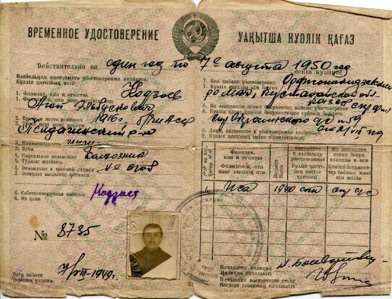 Временное удостоверение сроком на один год, выданное спецпоселенцу А.Э. Кодзоеву, 7 августа 1949 годаФото: Музей истории ГУЛАГа Мы приехали ночью. Сказать, что была темная ночь, нельзя, потому что все было белым-бело. Нас сгрузили на снег и оставили ждать до утра. Поезд уехал. Был страшный мороз. Костер разжечь нечем. Мы люди южные, в тапочках многие. Бабушка завернула меня в одеяло. Какой-то мужчина ходил между рядами людей и говорил: «Двигайтесь, шевелитесь, тот, кто засыпает, больше не проснется». Он поднимал тех, кто засыпал. Старики вспоминали, он многим спас жизнь. В ту ночь, я думаю, третья часть приехавших людей погибла. Наутро сидело по два-три замерзших вместе тела: отец, мать, ребенок. Особенно много было детей, кто-то лежал. Жуткая картина.