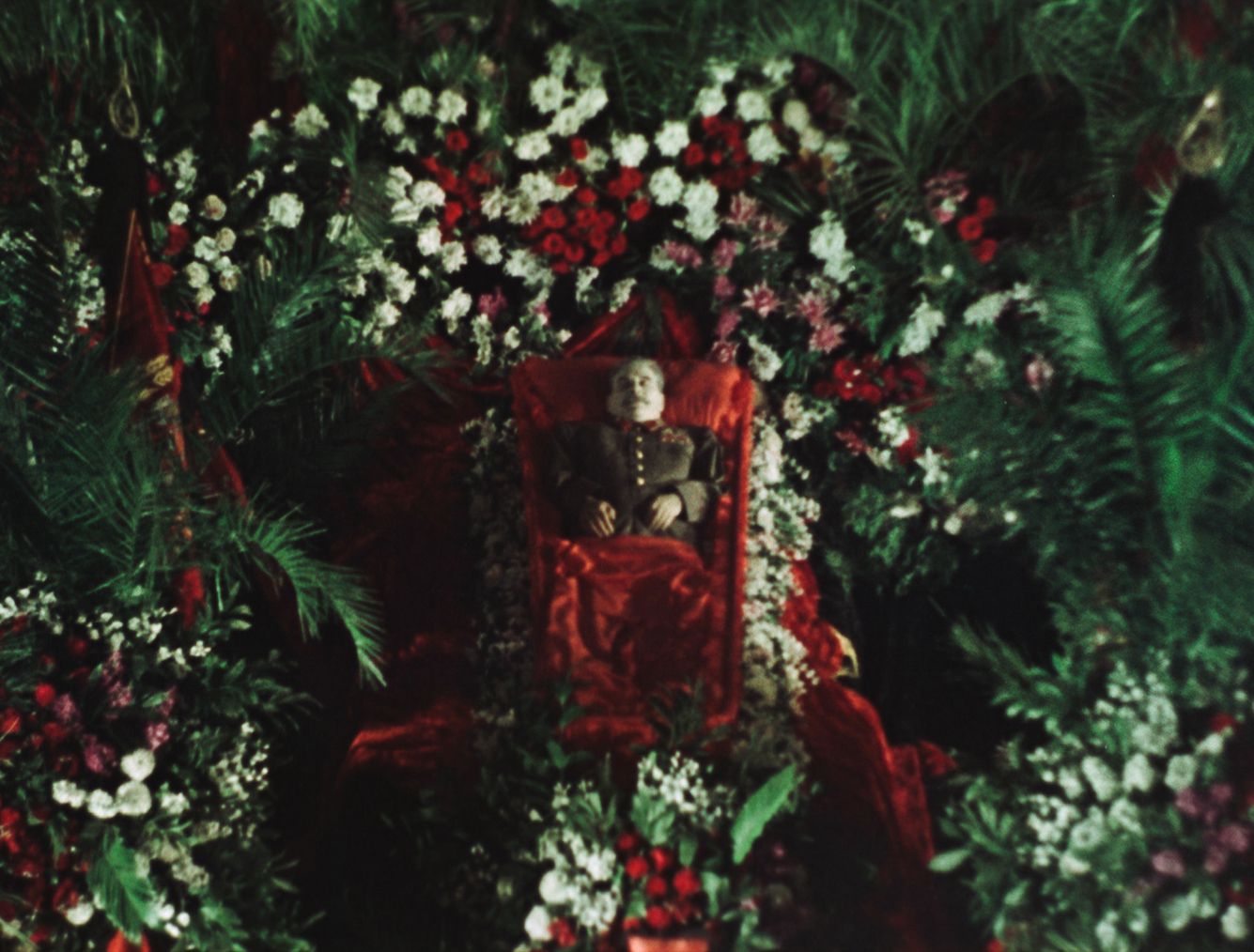 Ощущается и другой запах — гниющих цветов, в которых тонет труп генералиссимуса. Их несут и несут к гробу граждане Советского Союза. В какой-то момент из кадра вовсе исчезают люди, сюрреалистический пейзаж у Красной площади состоит из сплошных траурных венков. Невольно вспоминается голландская живопись (одна из стран — производителей «Государственных похорон» — Голландия), где цветочные натюрморты напоминали о бренности бытия, о неизбежности увядания и смерти. Впрочем, советские цветы не такие: закадровый радиоголос торжественно вещает о «венке из нержавеющей стали, бронзы и латуни».