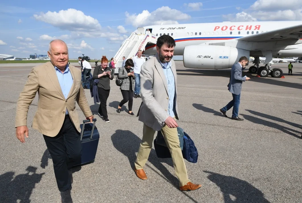 Российский борт с 35 освобожденными Украиной заключенными приземлился в московском аэропорту Внуково 7 сентбяря около 13:30. Россия еще не публиковала список тех, кого обменяла на украинцев — но такой список публиковали украинские СМИ. Самым известным на борту российского самолета точно был Кирилл Вышинский (на фото) — руководитель «РИА Новости Украина» в Киеве. Журналист свой арест считал политическим. Встречать его в аэропорт приехал глава «России Сегодня» Дмитрий Киселев.