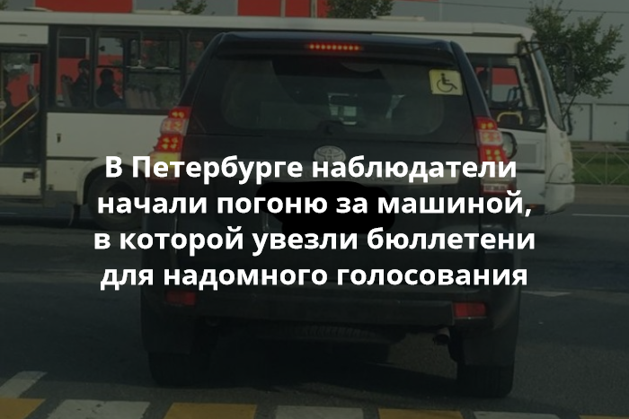 Утром 8 сентября в Купчине наблюдатели начали погоню за автомобилем, в который погрузили урны с бюллетенями для голосования. В УИК 2147 якобы поступило 300 заявок на надомное голосование.