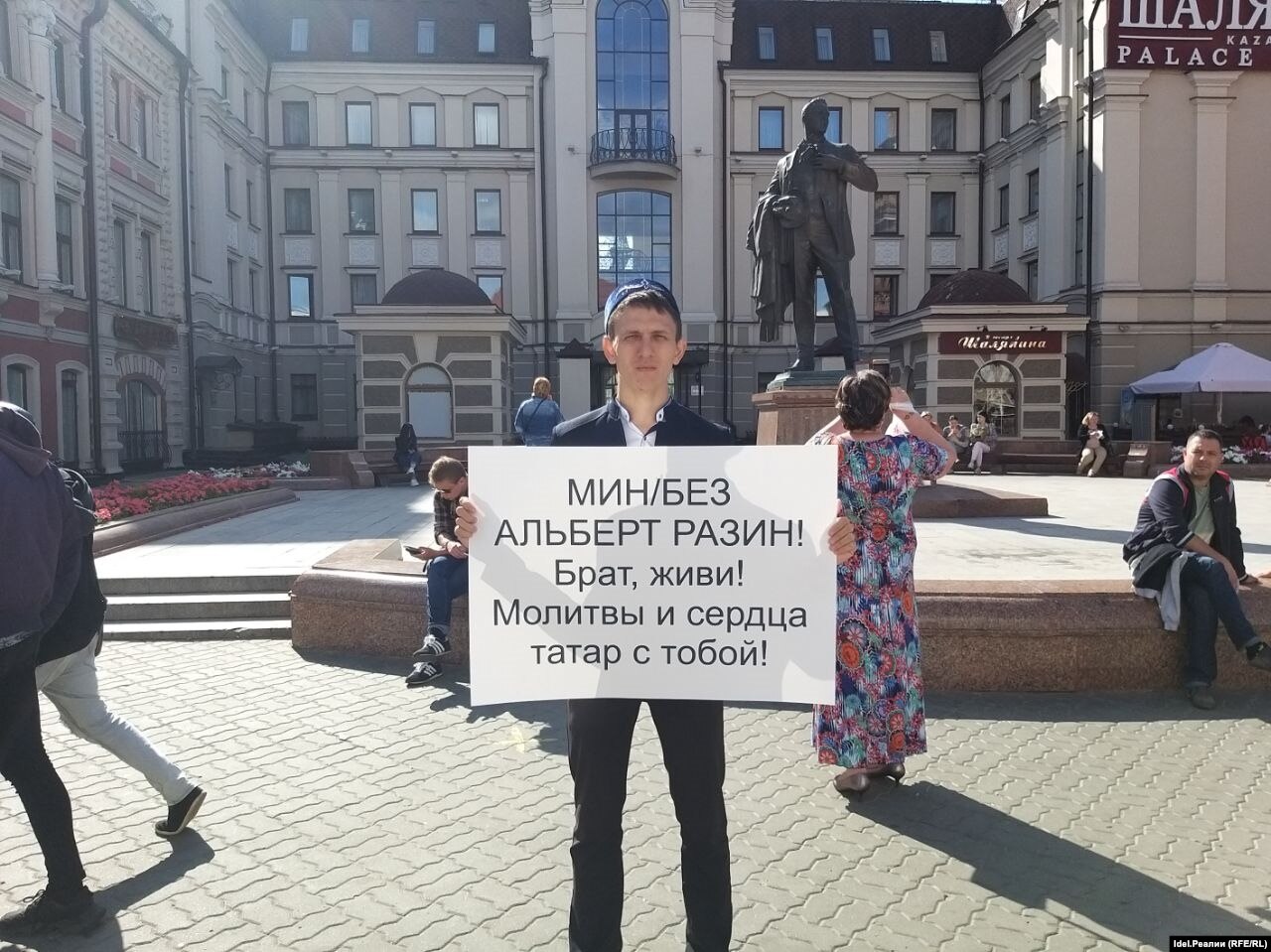 Он вышел к памятнику Шаляпину с плакатом "МИН/БЕЗ Альберт Разин! Брат, живи! Молитвы и сердца татар с тобой!" (мин/без — с татарского я/мы — "Idel.Реалии").