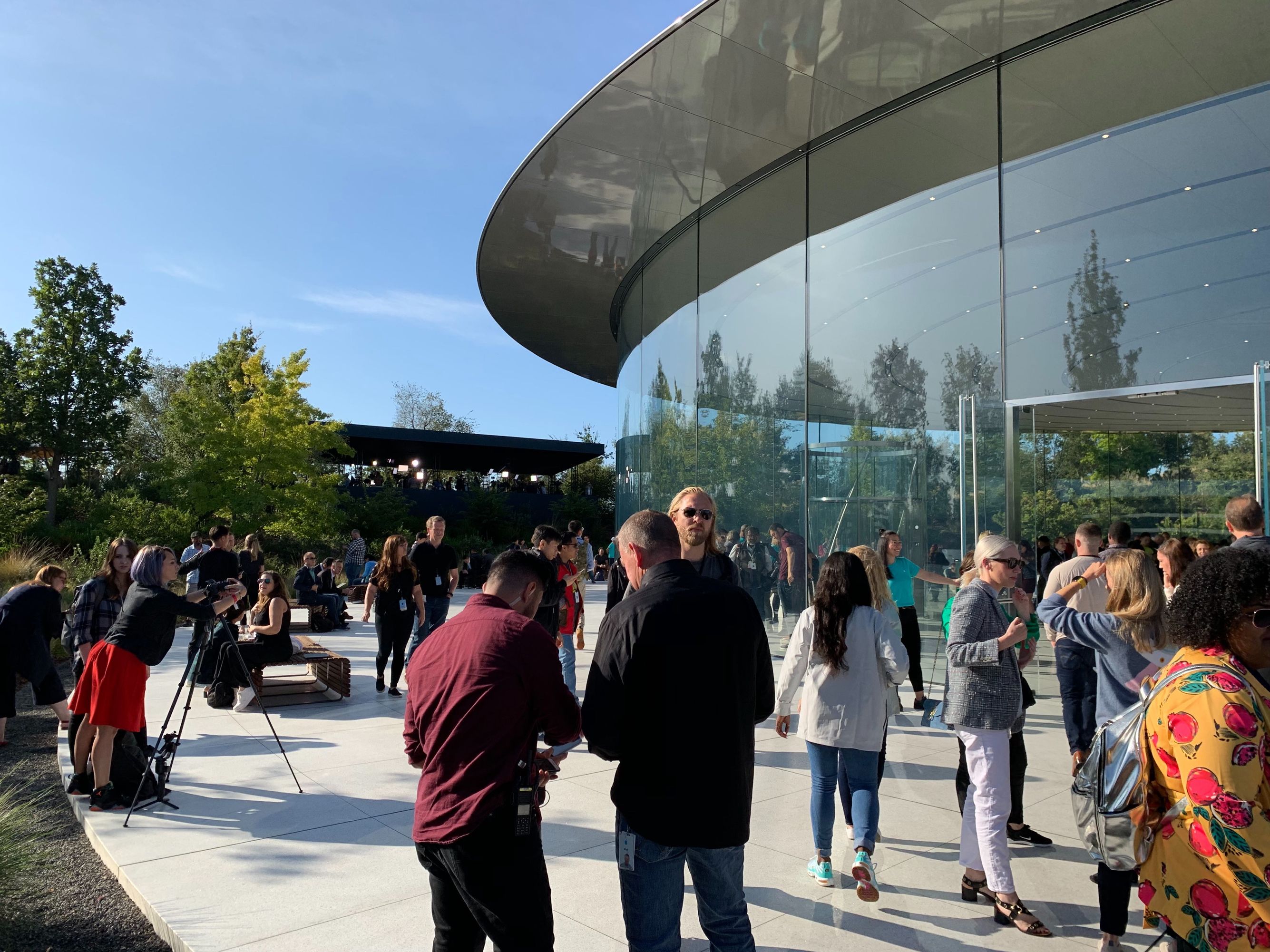 Расскажу немного о театре Стива Джобса, в котором и проходит презентация Apple. Это здание без колонн — то есть вообще. Все опирается исключительно на стеклянные стены. Здание (и штаб-квартира в том числе) стоят на специальных платформах. В случае землетрясения они просто начнут «танцевать». Все вокруг может рухнуть, а Apple устоит. И почему об этом еще не написали в книгах о постапокалипсисе?