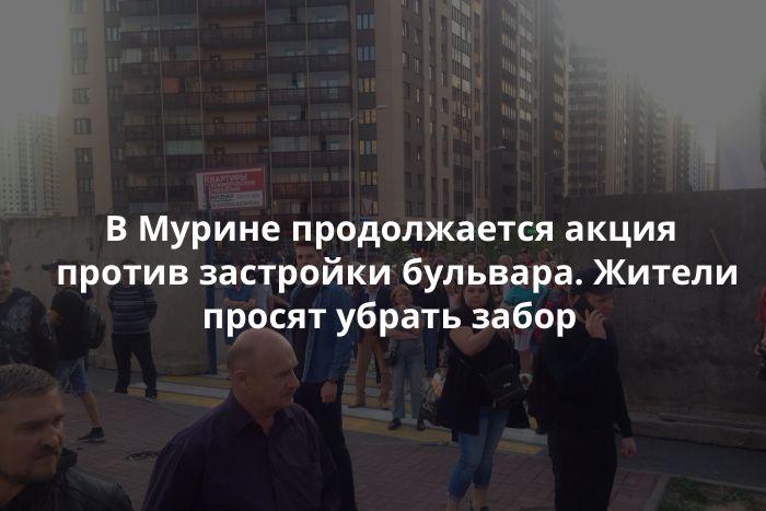 Днем 10 сентября жители Мурина вышли на акцию протеста против застройки бульвара Менделеева. По их словам, стройку хотят начать на пешеходной части бульвара, которая является одним из немногих проходов к метро.