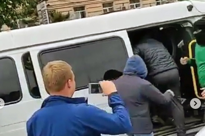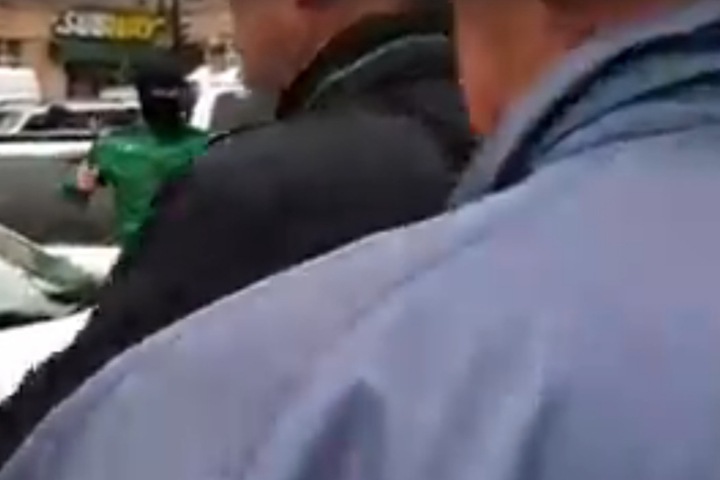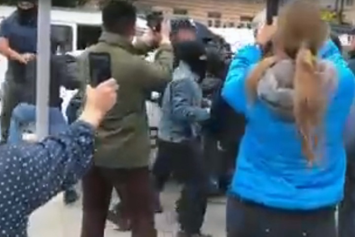 UPD (19:00) Вот более качественные скриншоты видео задержания Баирова, на котором заметен мужчина с топориком. Около 10 человек в масках и гражданской одежде вытащили активиста из машины и затолкали в «Газель» без номеров.