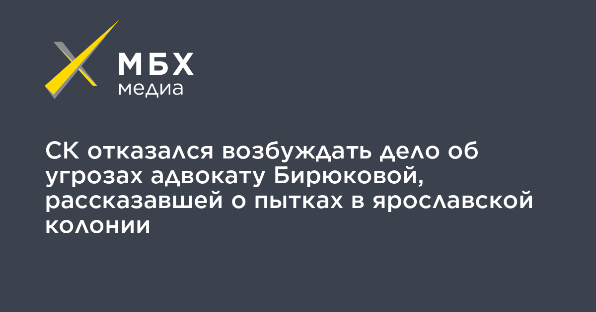 Следственный комитет по Ярославской области не стал возбуждать дело по статье об угрозе убийством или причинением тяжкого вреда здоровью (ч.1 ст. 119 УК) из-за угроз адвокату «Общественного вердикта» Ирине Бирюковой, которая обнародовала информацию о пытках в ярославской ИК-1. Об этом сообщается в телеграм-канале «Общественного вердикта».