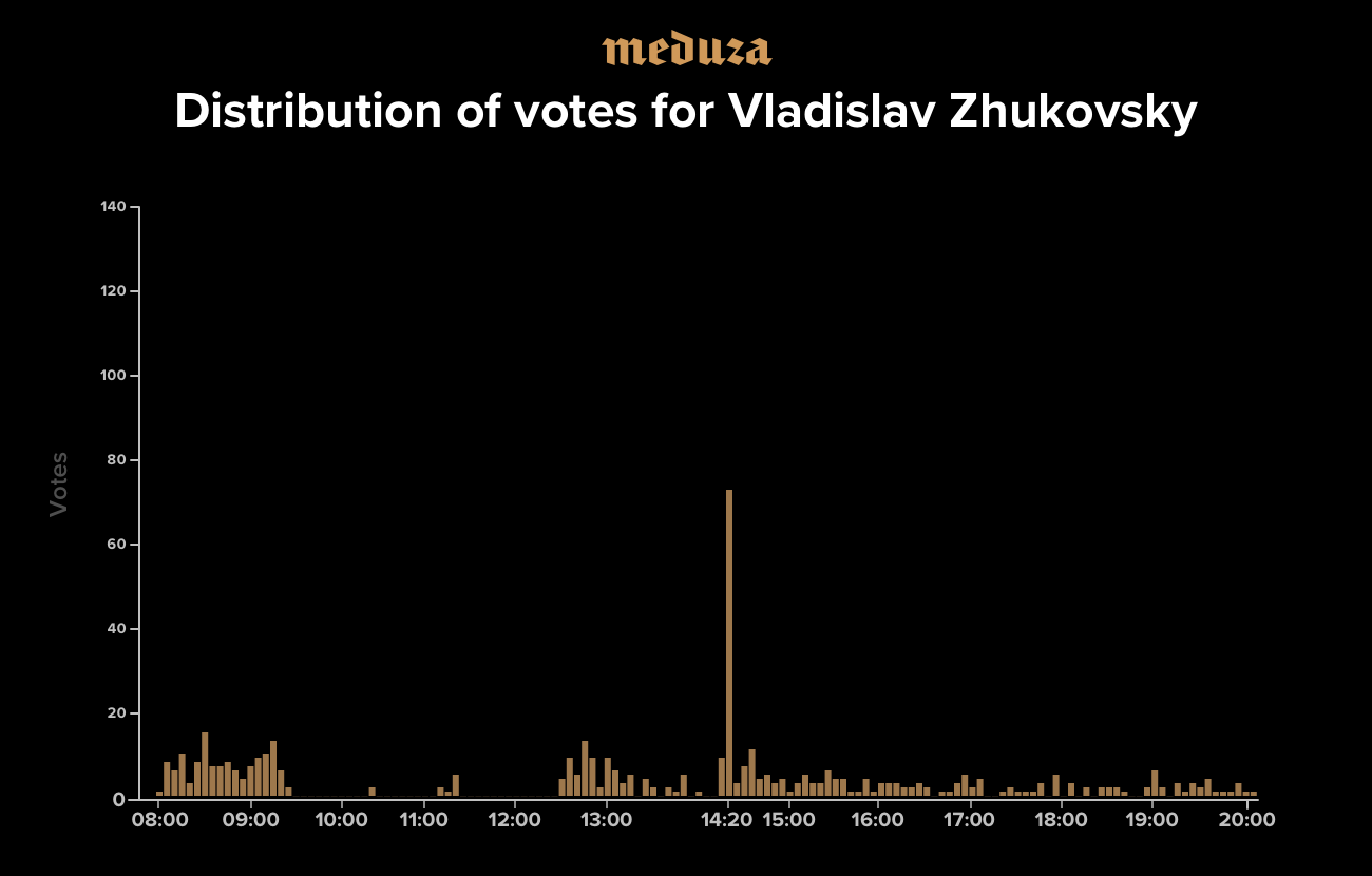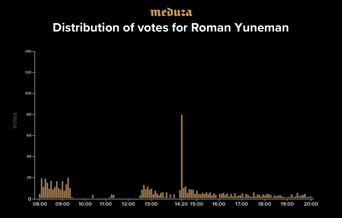 Here’s where we do need those decrypted votes. Let’s look at the distribution of votes among three competitors in a single district: The independent candidate Roman Yuneman, the pro-regime candidate Margarita Rusetskaya, and Vladislav Zhukovsky, a Communist Party candidate who was listed in opposition politician Alexey Navalny’s Smart Vote program. The bursts of votes did not favor any single candidate to a degree that looks suspicious on its face.