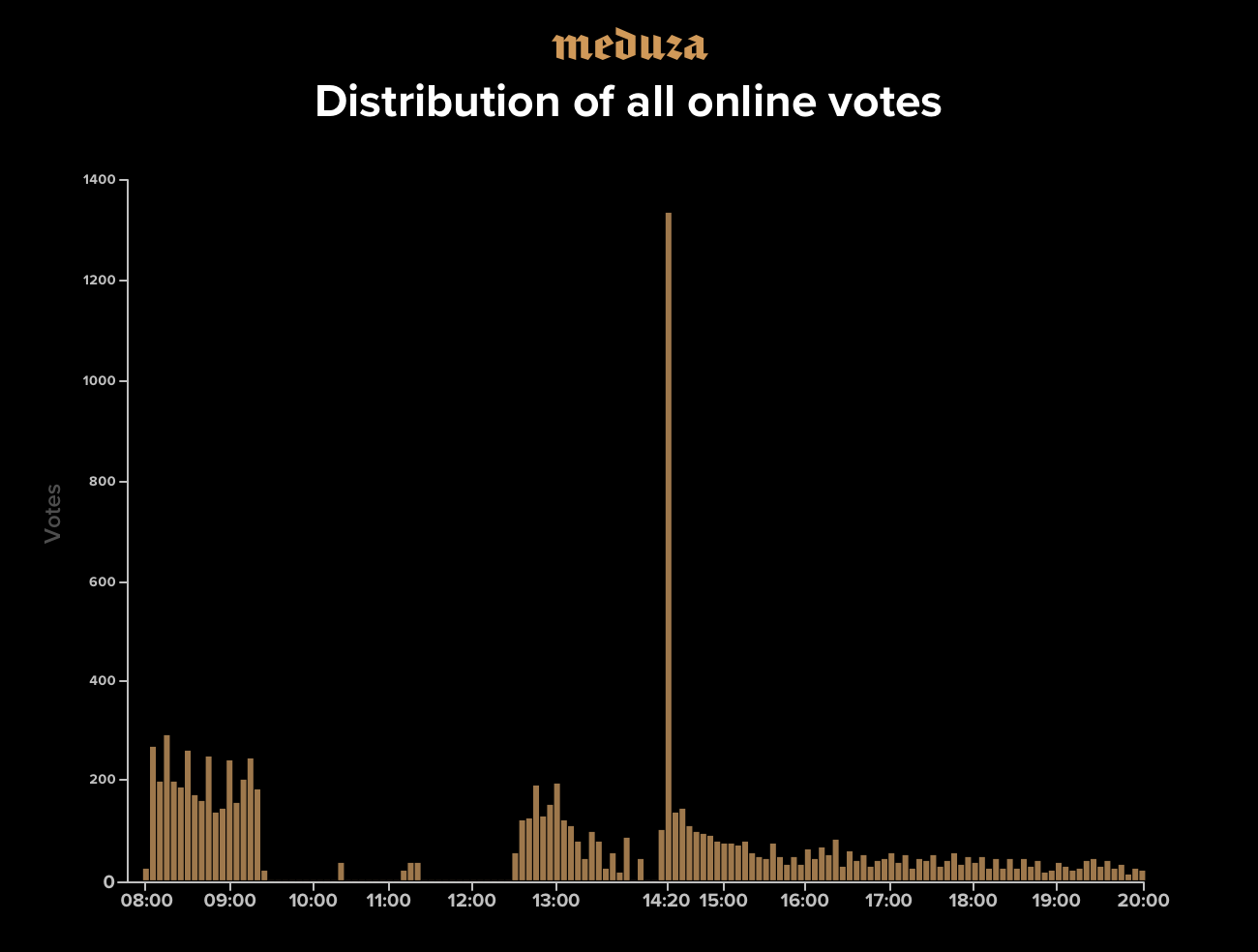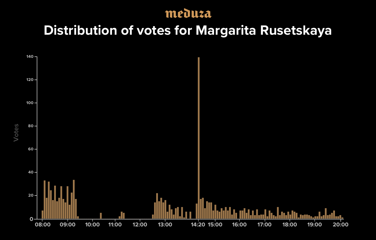 To get a sense of how precisely Moscow’s online voting can be reconstructed, take a look at the contest between Roman Yuneman and Margarita Rusetskaya. The video below tracks the difference between the two candidates’ vote totals by taking the final results of paper voting as a given from the start and then progressively adding online ballots as they were recorded over the 12-hour voting period. The result shows how Yuneman’s 581-vote lead over Rusetskaya in paper voting gradually crumbles into an overall 84-vote loss due to online voting.