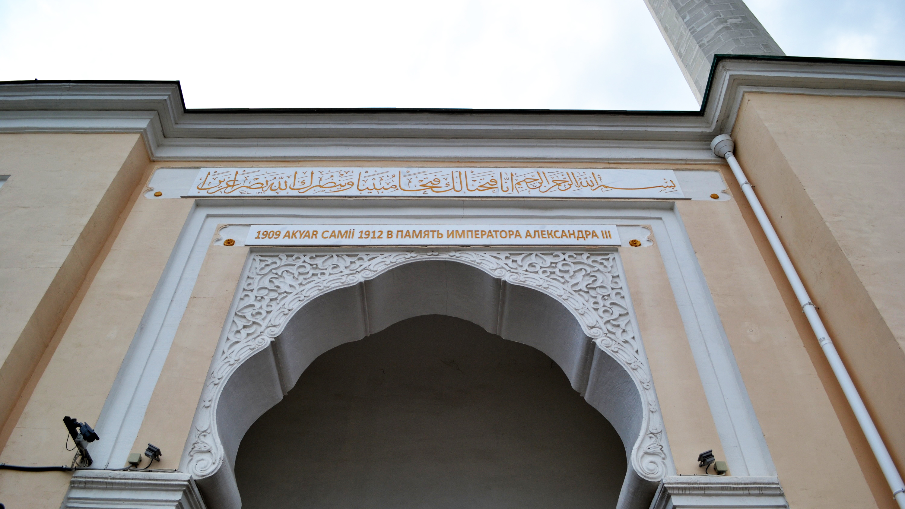 Надпись над порталом мечети говорит о том, что мечеть строилась с 1909 по 1912 год в память императора Александра III. Однако из-за отсутствия средств реальное строительство затянулось еще на два года. Об этой надписи знают далеко не все севастопольцы, поскольку с улицы ее не видно.