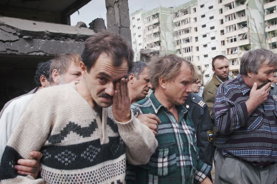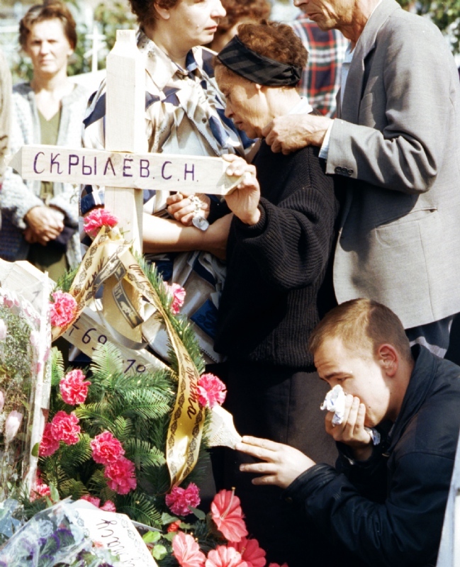 Похороны 30-летнего Сергея Скрылева, погибшего в результате теракта в Волгодонске 16 сентября 1999 годаФото: Константин Завражин/PhotoXPress Когда дом упал, хозяева пробирались в свою квартиру по двери, лежавшей между плит, — документы собирали, самое ценное вынесли. А дедушку не нашли. Но он был там, лежал под сорванной с петель дверью, по которой ходили его родственники.