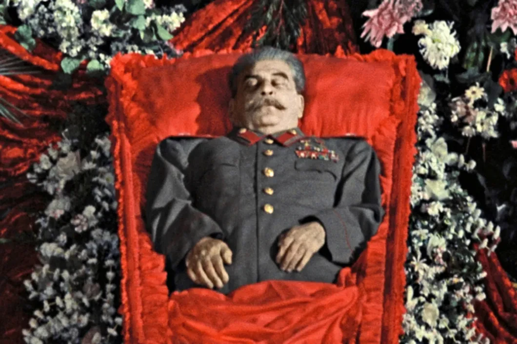 Люди поднимаются по лестнице с драпированными красным шелком перилами и траурными цветами. Пытаются разглядеть божка, возлежащего в тропиках цветов, тонущего в них. Рядом с гробом — раздавленный, напуганный Василий Сталин, рука об руку с ним — Светлана Аллилуева с непроницаемым выражением лица. Слуги власти бдительно охраняют гроб, не подпуская «чужих»: новоиспеченный премьер Маленков, Берия, Молотов, Булганин, Каганович — в престижном первом ряду. Берия подозрительно посверкивает очками.