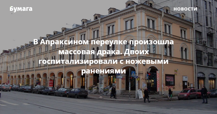 Неподалеку от Апраксина переулка в центре Петербурга произошла массовая драка. Как сообщает ГУ МВД по городу, в конфликте есть как минимум два пострадавших — оба мужчины, у которых диагностировали ножевые ранения. Возбуждено уголовное дело по статье об умышленном причинении средней тяжести вреда здоровью (ст. 112 УК РФ).