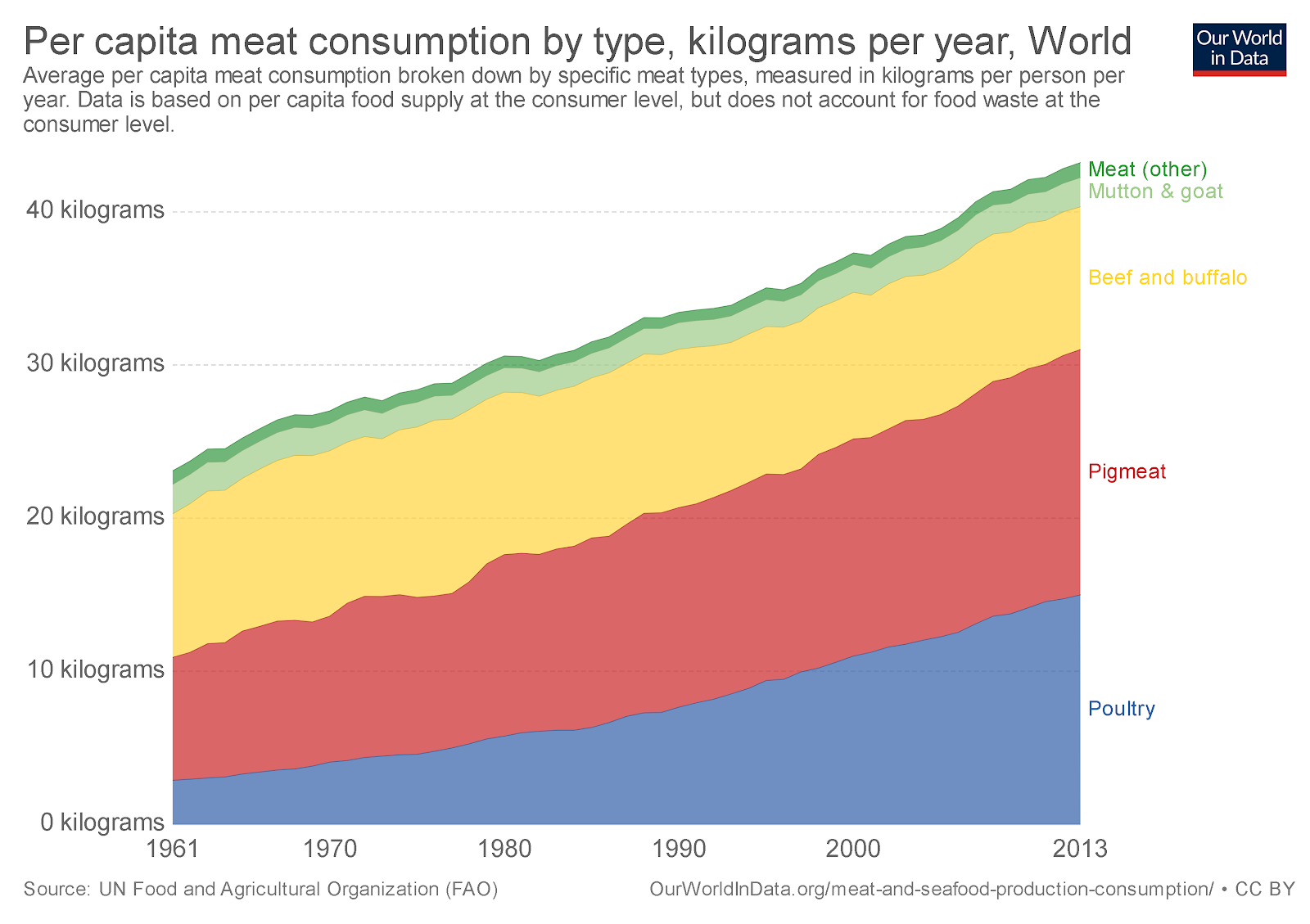 При этом с каждым годом, ввиду увеличения количества людей на Земле и экономического роста во многих странах, уровень потребления мяса, а соответственно и количество животных на фермах, также увеличивается.