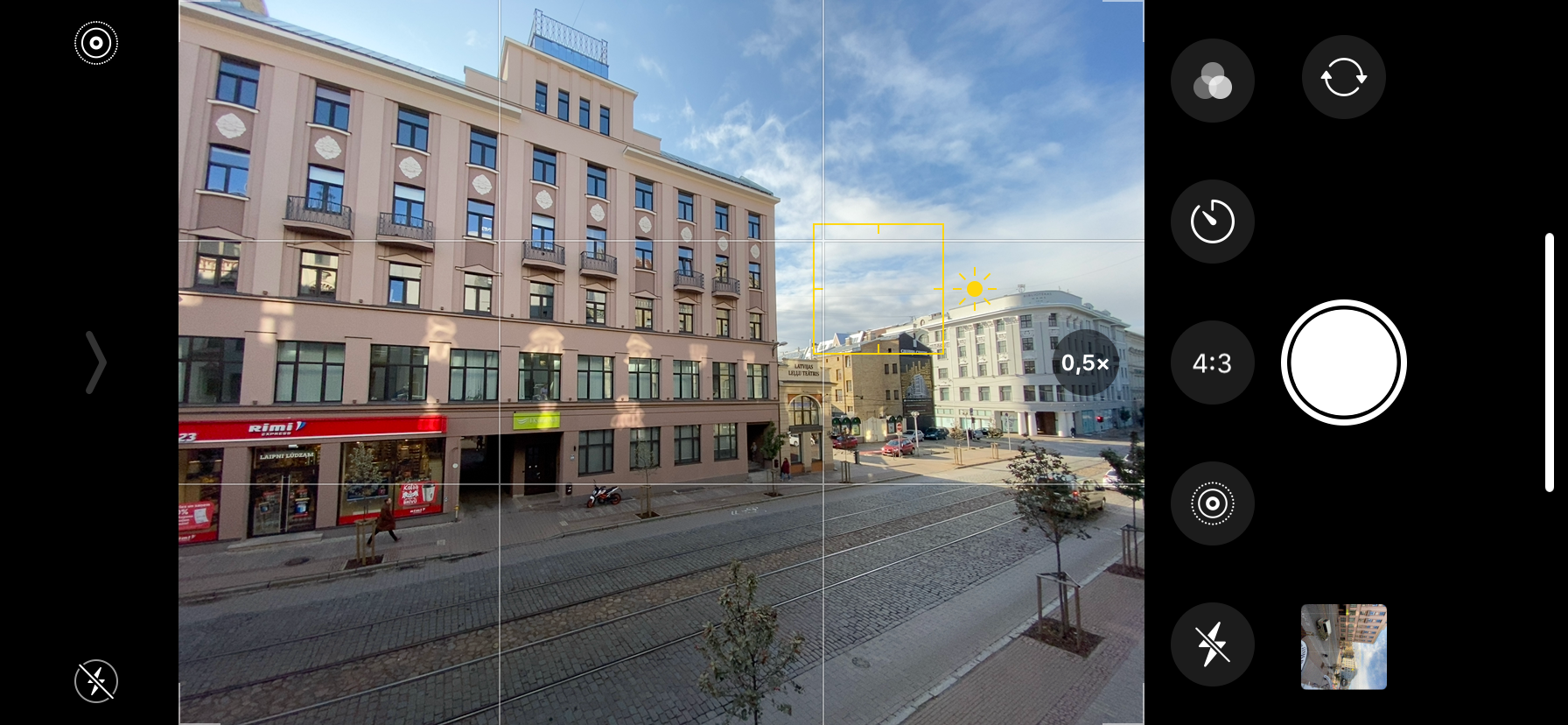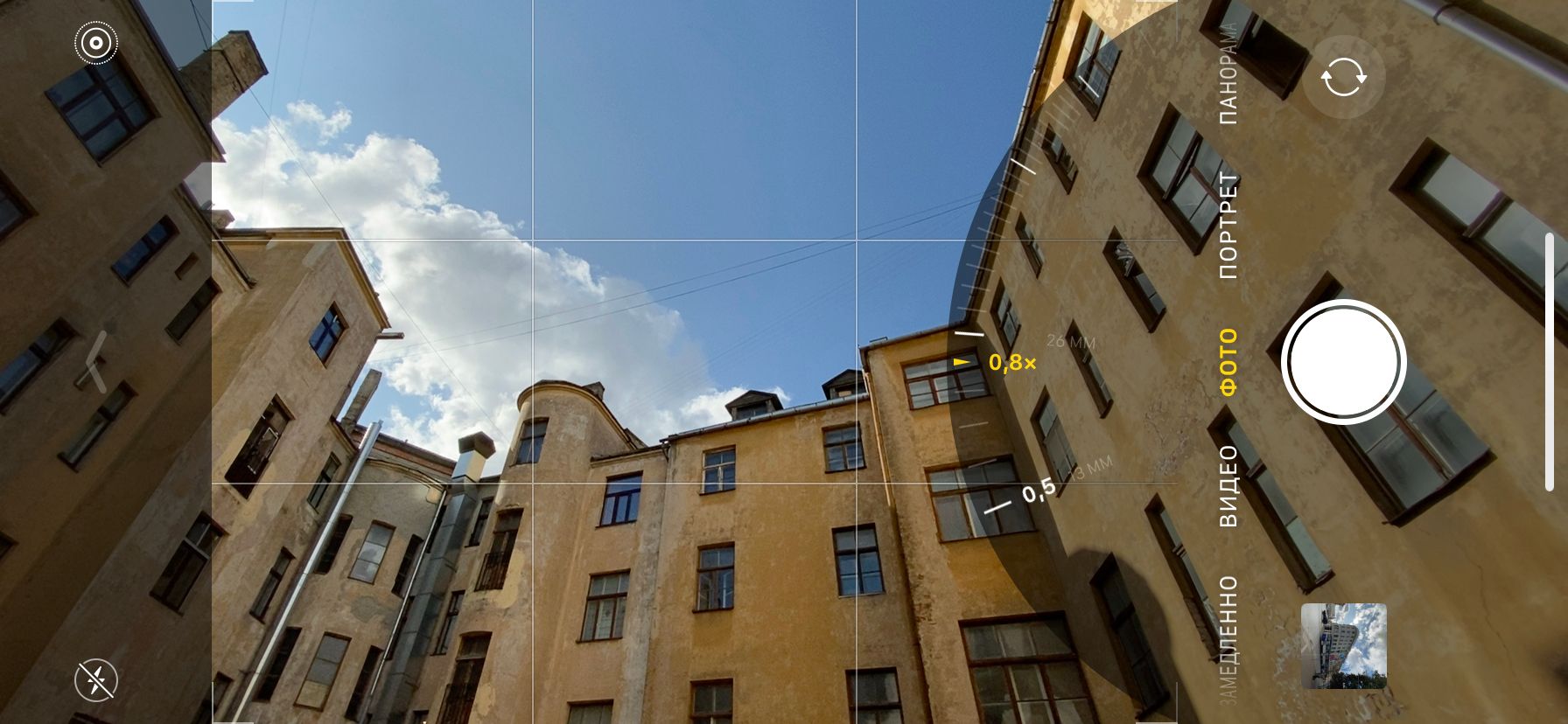 Обновился и режим переключения между камерами (или между режимами увеличения). Если зажать палец на иконке, появится колесико, с помощью которого можно плавно менять масштаб с 0,5x — это широкоугольная камера — до 1x (основная) и дальше, до 5x (цифровой зум). И снова переключение между 0,9x, когда показывается увеличенная картинка с широкоугольной камеры, и 1x происходит практически бесшовно.