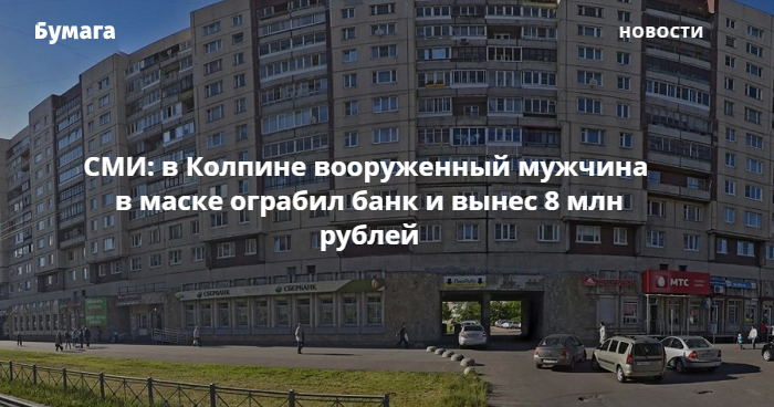 Вечером 17 сентября в Колпинском районе Петербурга мужчина в медицинской маске и с пистолетом ограбил банк «Совкомбанк» и унес с собой более 8 млн рублей. Об этом пишет «Фонтанка».