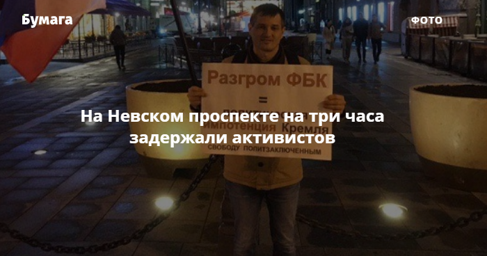 Вечером 17 сентября полицейские задержали трех активистов «Бессрочного протеста» Андрея Макашова, Евгения Мусина и Семена Ткачука, стоявших в одиночных пикетах на Невском проспекте. Об этом сообщила «Группа помощи задержанным».