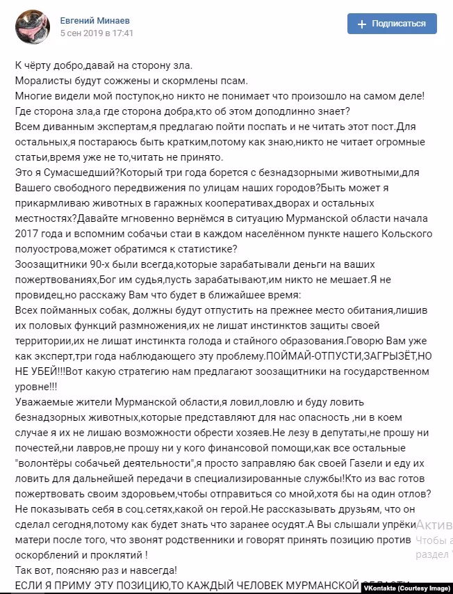 О том, что Минаев и дальше будет продолжать свою деятельность, он написал в своем манифесте на странице "ВКонтакте". В нем он утверждает, что своими действиями спасает город от бродячих животных.