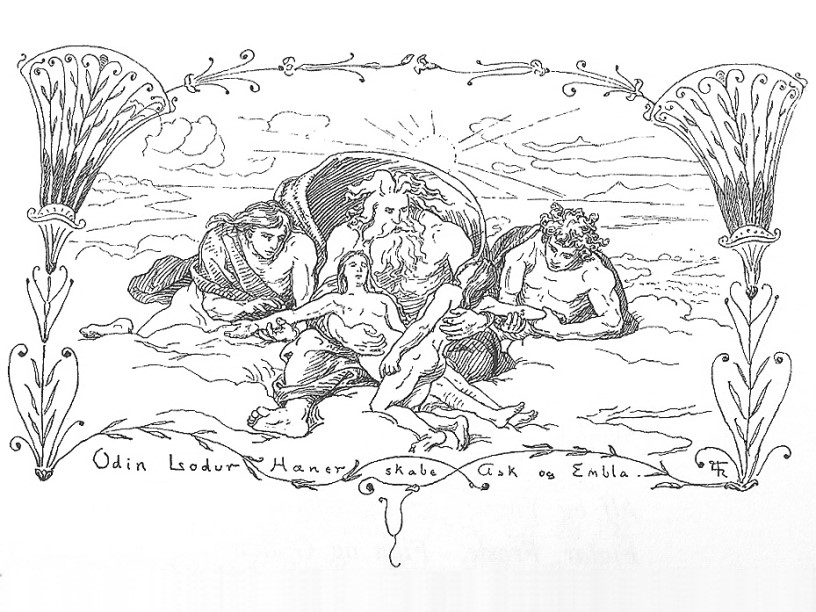 Боги занимают доминирующее место в мире, который делят с карликами, великанами, альвами (о них известно крайне мало) и немногочисленными монстрами — отпрысками Локи и великанши Ангрбоды. Пока в этом мире нет людей, некому приносить жертвы богам. В один прекрасный день три бога — Один, Хёнир и Лодур — отправились на прогулку, судя по всему, к морю и на берегу обнаружили, что там лежат «малопригодные / Аск и Эмбла, лишенные судьбы». Три бога взялись за дело и превратили ствол ясеня (Аск) и другой ствол (с ним сложнее, значение слова «эмбла» точно никто не знает, хотя скорее всего это вяз[1]) в первую пару людей: