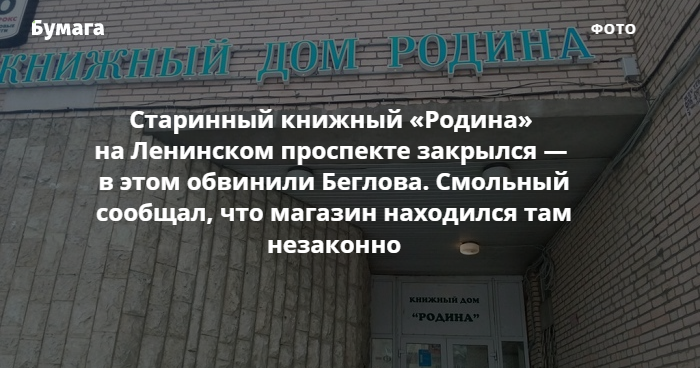 Книжный магазин «Родина» на Ленинском проспекте, 127 закрылся. На дверях магазина нашли бумажный лист, в котором в этом обвиняли губернатора Петербурга Александра Беглова. Об этом сообщили очевидцы.