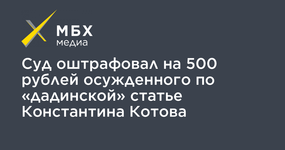 Мировая судья судебного участка № 219 Реутова оштрафовала на 500 рублей осужденного по «дадинской» статье (ст. 212.1 УК) Константина Котова, сообщила «МБХ медиа» адвокат Ирина Яценко.