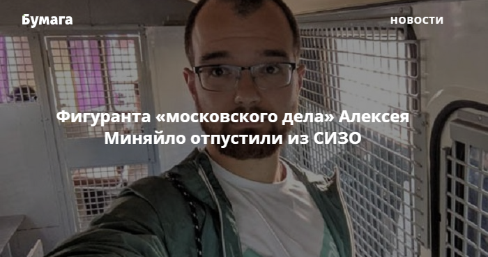 Басманный районный суд Москвы освободил из СИЗО обвиняемого по «московскому делу», волонтера штаба Любови Соболь Алексея Миняйло. Об этом пишет «Медиазона» из зала суда.