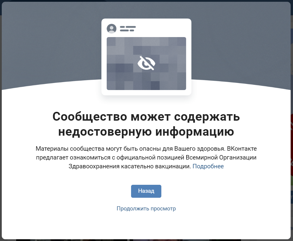 При заходе на страницы пабликов, выступающих за отказ от прививок, появляется информация о потенциальной опасности со ссылкой на данные ВОЗ. Соцсеть планирует продолжит работать над инструментами, которые помогают бороться с распространением недостоверной информации.