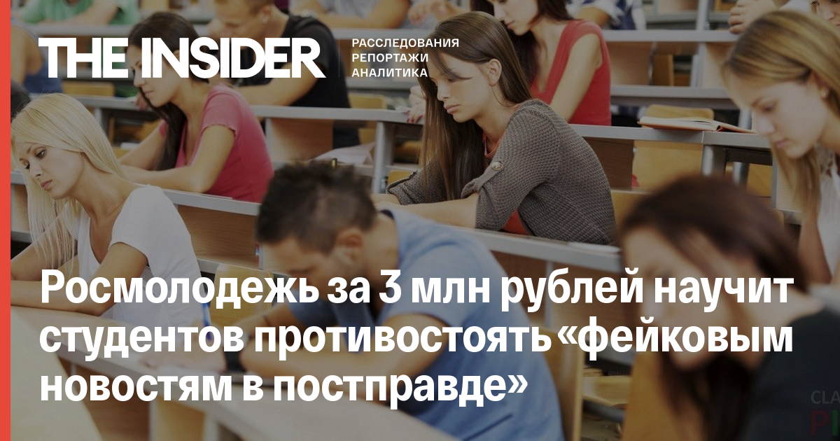 Федеральное агентство по делам молодежи обучит студентов информационным инструментам манипуляции и противодействию «фейковым новостям в постправде». Как пишут «Ведомости», информацию о соответствующем конкурсе ведомство разместило на сайте госзакупок. Сумма закупки — 3 млн рублей.