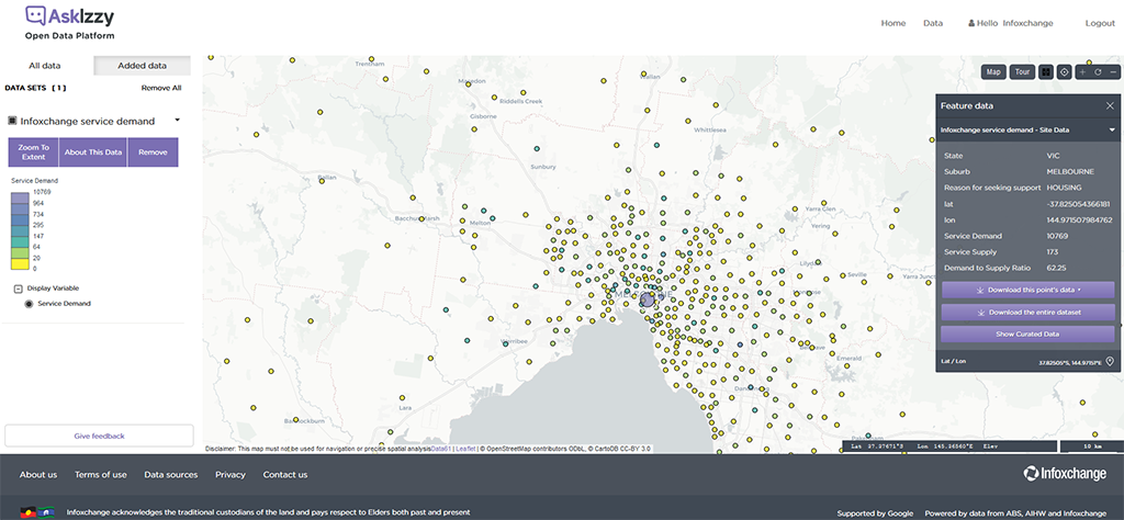 Выбрав категорию, вы перейдете на карту, нажимая на точки, можно увидеть детализированную информацию: общее количество данных поиска в каталоге Infoxchange (спрос) для этого местоположения, а также общее количество предлагающих услуги (предложение) и отношение спроса к предложению.