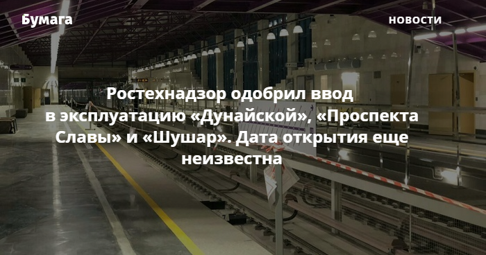 Ростехнадзор выдал разрешение на ввод в эксплуатацию трех новых станций петербургского метрополитена «Дунайская», «Проспект Славы» и «Шушары». Об этом пишет ТАСС со ссылкой на источник, близкий к ведомству.