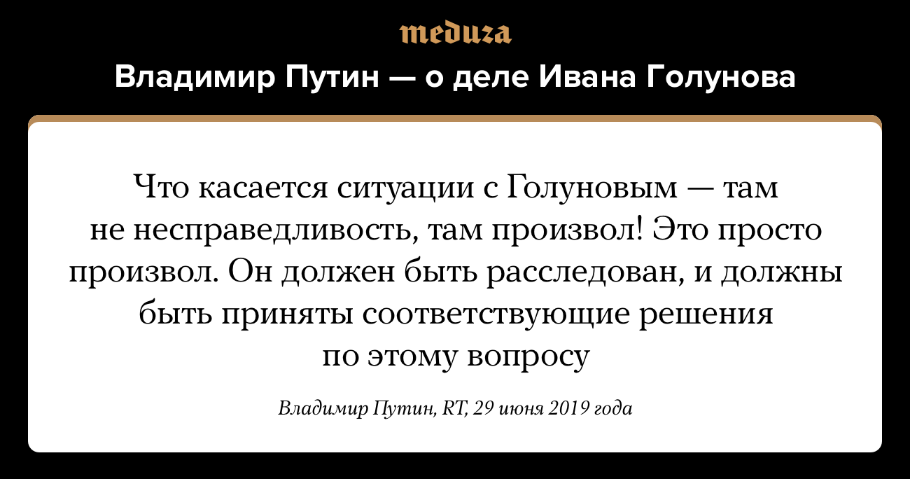 — Ну, следствие у нас процессуально самостоятельное. С учетом того, что именно в отношении Голунова было совершенно преступление, конечно, мы вправе требовать определенного ускорения принятия процессуальных решений — и для защиты его прав. Это мы можем. В ближайшее время мы этим и займемся. У нас до настоящего времени не было сомнения, что следствие реально идет по верному пути.