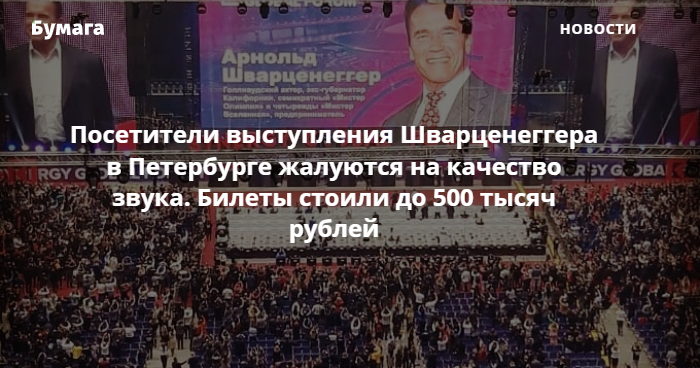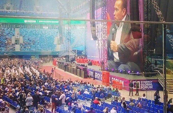 Некоторые посетители бизнес-форума «Синергия» на «Газпром Арене», где утром 4 октября выступал Арнольд Шварценеггер, пожаловались на проблемы с организацией мероприятия. В частности, по их словам, на лекции голливудского актера было низкое качество звука и проблемы с синхронным переводом.