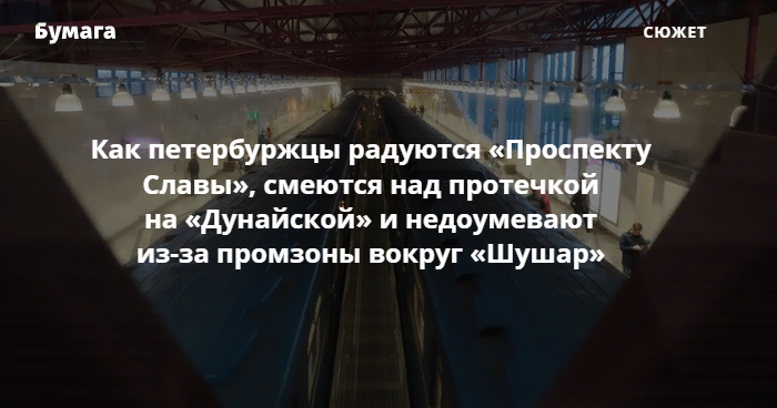 В Петербурге вечером 3 октября после пяти лет строительства и семи переносов открыли новые станции фиолетовой линии: «Проспект Славы», «Дунайскую» и «Шушары». Уже в первые часы на «Дунайской» протек потолок, а на «Проспекте Славы» сломался траволатор. Петербуржцы радуются «Проспекту Славы», но не понимают, зачем было строить «Шушары» так далеко от жилых домов.