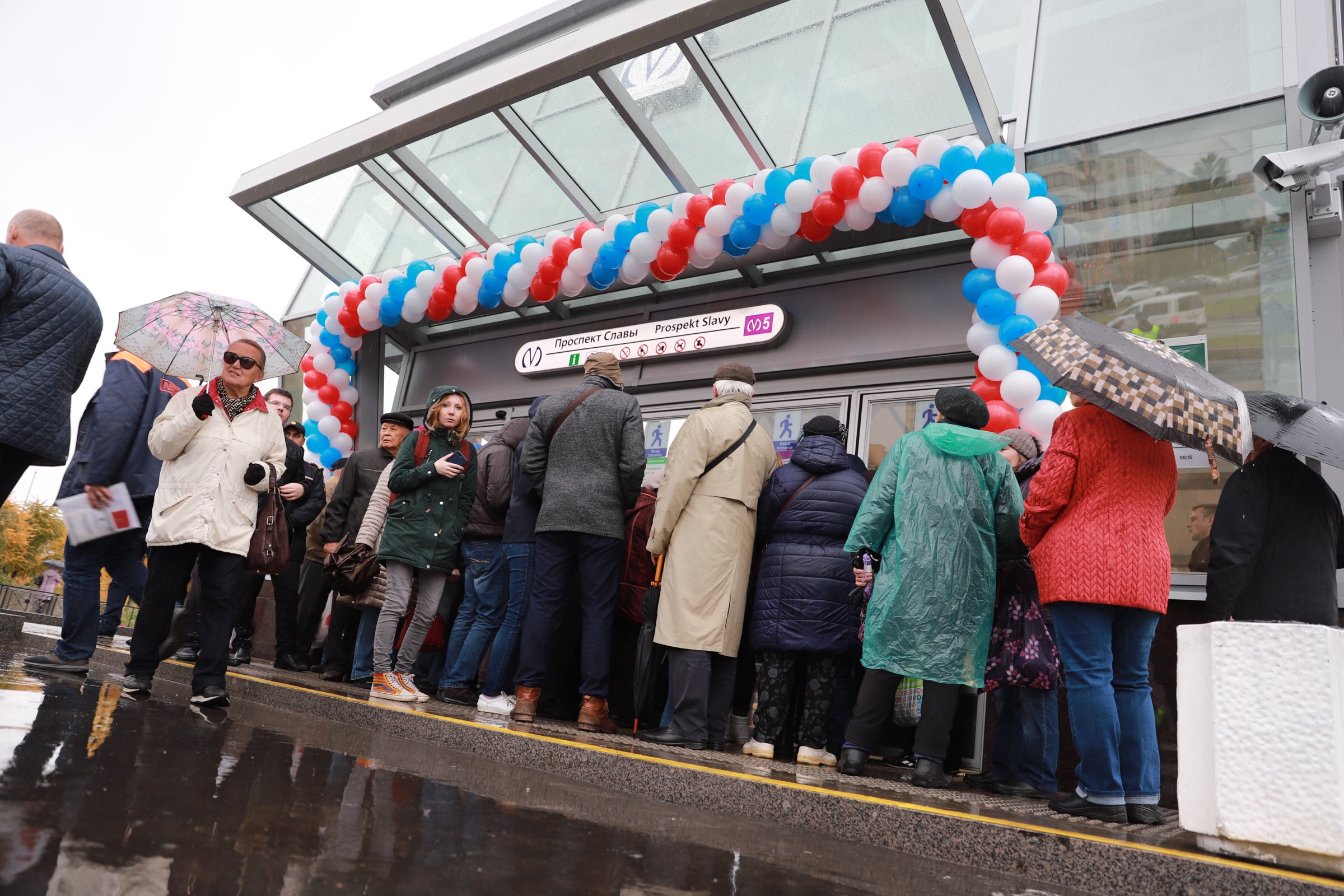 В день открытия в очередь к станции «Проспект Славы» петербуржцы выстроились заранее, несмотря на дождь.