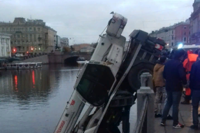 На набережной Фонтанки автокран пробил ограждение и упал в реку