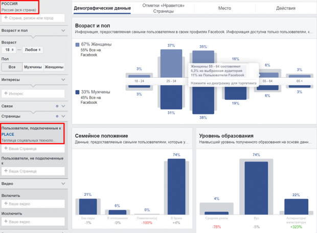 Зайдите в раздел по ссылке: (или в AdsManager перейдите в раздел «Аудитории» – «Статистика аудитории»). Настройте аудиторию, которую будете анализировать: подписчики вашей страницы («Пользователи, подключенные к PAGE») или интересная вам аудитория. Можно будет узнать демографические данные: возраст, пол, семейное положение, уровень образования, должность. А также как часто аудитория подписывается на страницы, комментирует посты, лайкает и репостит публикации и с каких устройств.