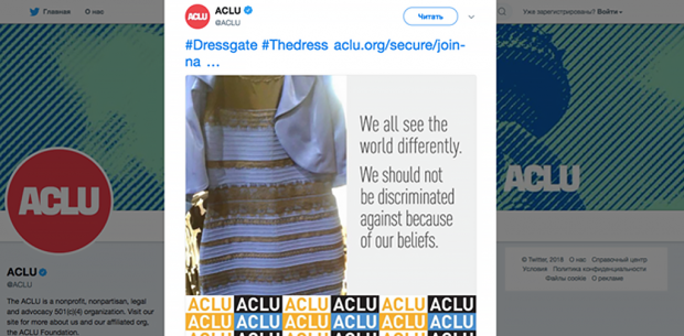 Как это работает? В 2015 году пользователи всего мира пытались определить, какого цвета платье: голубое с черными полосками или белое с золотыми. Феномен синего или белого платья. Американский союз защиты гражданских свобод (ACLU) опубликовал в своем Twitter пост с той же самой картинкой и подписью: «Мы все видим мир по-разному. Мы не должны подвергаться дискриминации из-за наших взглядов».