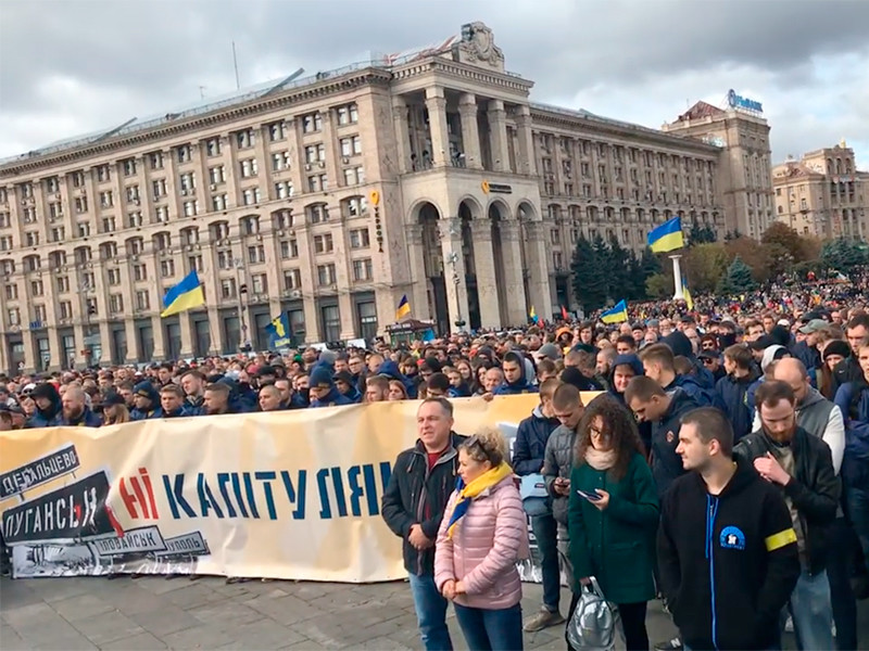 В Киеве и нескольких десятках городов Украины прошла акция протеста против подписания Украиной "формулы Штайнмайера" (определяет порядок проведения выборов в Донбассе и присвоения территории особого статуса), сообщает УНИАН. В столице, по оценке полиции, вышло около 10 тыс. человек.
