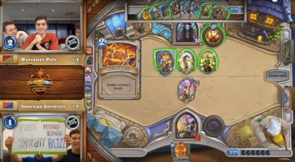 Во время стрима студенческого чемпионата по Hearthstone в США одна из команд показала плакат «Free Hong Kong, boycott Blizz» («Освободите Гонконг, бойкотируйте Blizzard»). Комментаторы матча никак не отреагировали, а прямую трансляцию команды отключили сразу и на весь день.